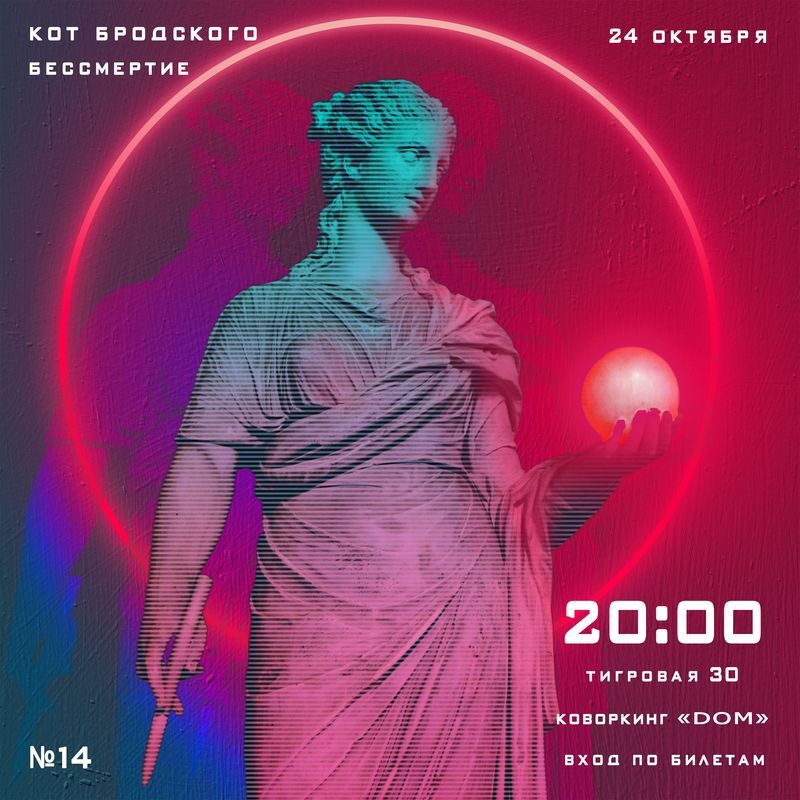 Бессмертный выпуск «Кота Бродского» пройдет 24 октября в коворкинге DOM (ул. Тигровая, д. 30). Сбор гостей и «живая» музыка в 19:00, начало в 20:00. Возрастное ограничение 18+. Вход 300 р. (в день мероприятия − 400 р.). Подробности — https://vk.com/kotbrodskogo14.