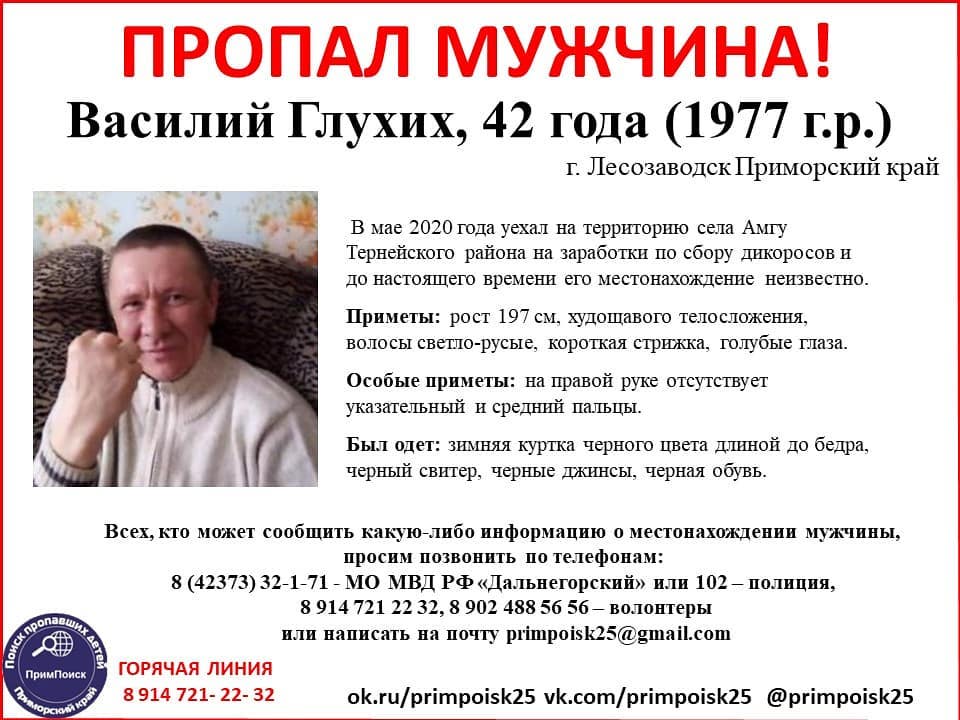 В Приморье продолжаются поиски 42-летнего Василия Глухих. Об этом сообщает «ПримПоиск».