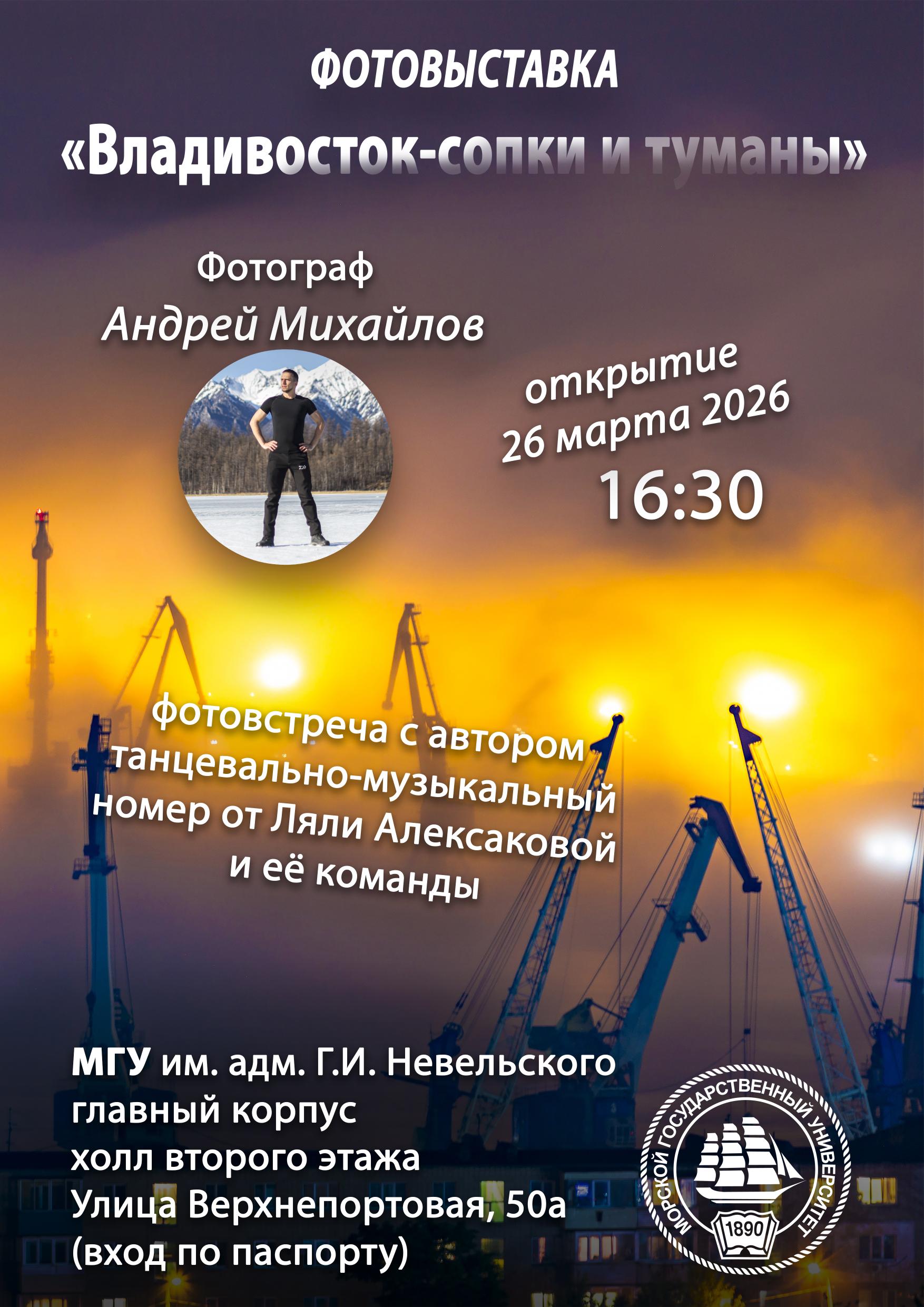 Интервью с фотографом Андреем Михайловым, который знает, как поймать туман. Фотовыставка автора в настоящее время находится в библиотеке им.Чехова. Вы можете полюбоваться ею в любое удобное время. 26 марта фотовыставка переезжает в МГУ им. адм. Г.И. Невельского. 26 марта в главном корпусе, в холле второго этажа состоится открытие выставки в 16:30. Адрес: улица Верхнепортовая, 50а. Выставку смогут посетить все желающие, при себе нужно иметь паспорт. Гости смогут пообщаться с фотографом, задать вопросы о картинах и о жизни. Так же коллектив Ляли Алексаковой исполнит номер «Владивосток – наш любимый город». Возрастное ограничение (0+).