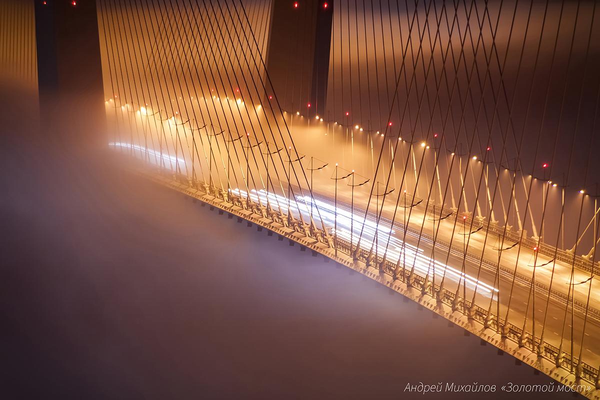 В результате получается почти графическое изображение: чёткие линии вант, массивные пилоны и светящиеся трассы, разрезающие белую пелену.