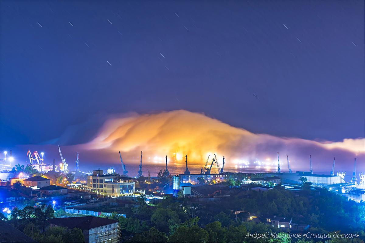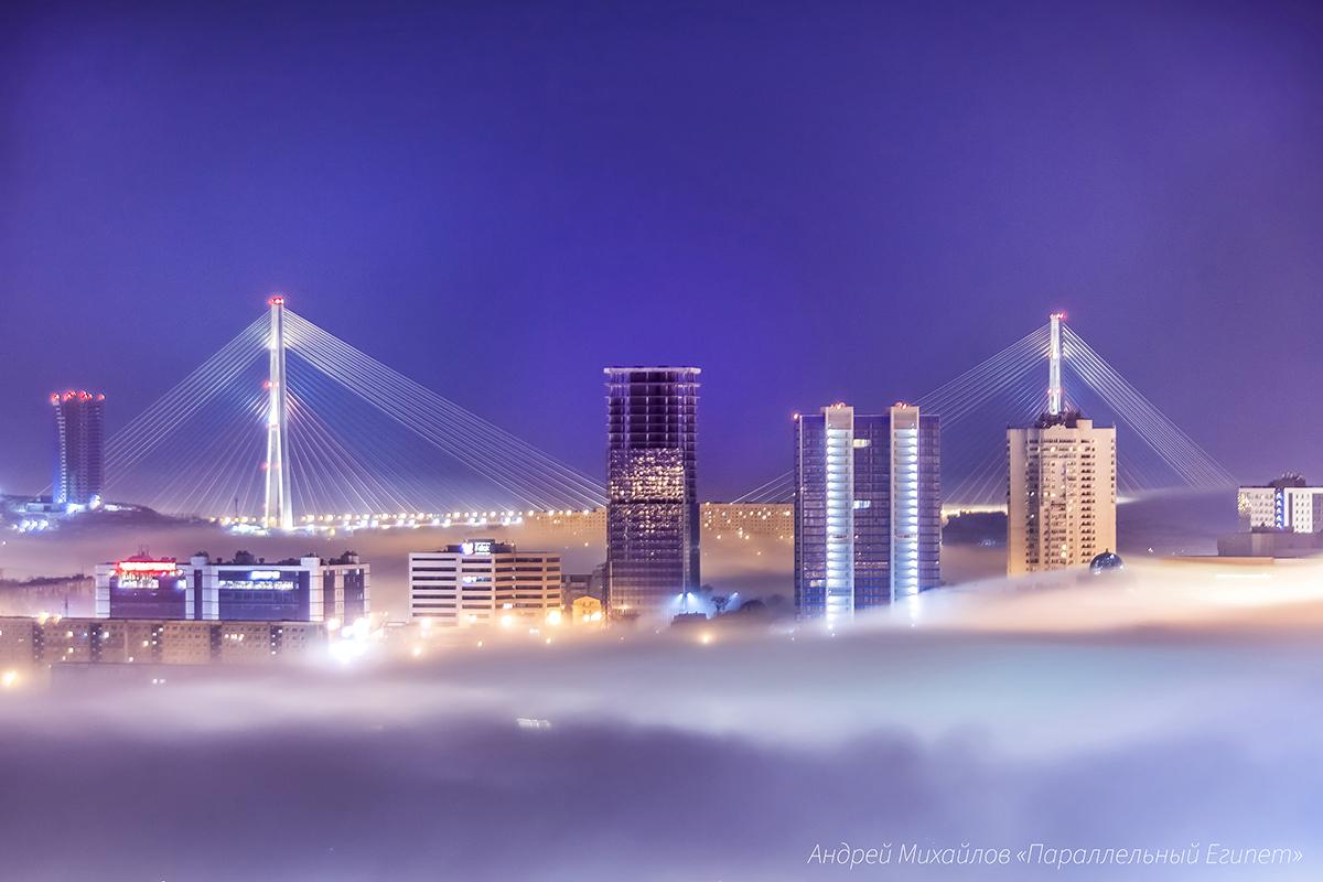 Я выбежал из квартиры и поехал на видовую площадку у фуникулёра. У меня перехватило дыхание: город парил над туманом. Дома, мосты, опушки сопок — всё это левитировало в воздухе, словно мираж. А внизу, в дымке, проступали бегущие огни машин и кораблей — они скользили, мерцали, будто светлячки в ночной тишине.