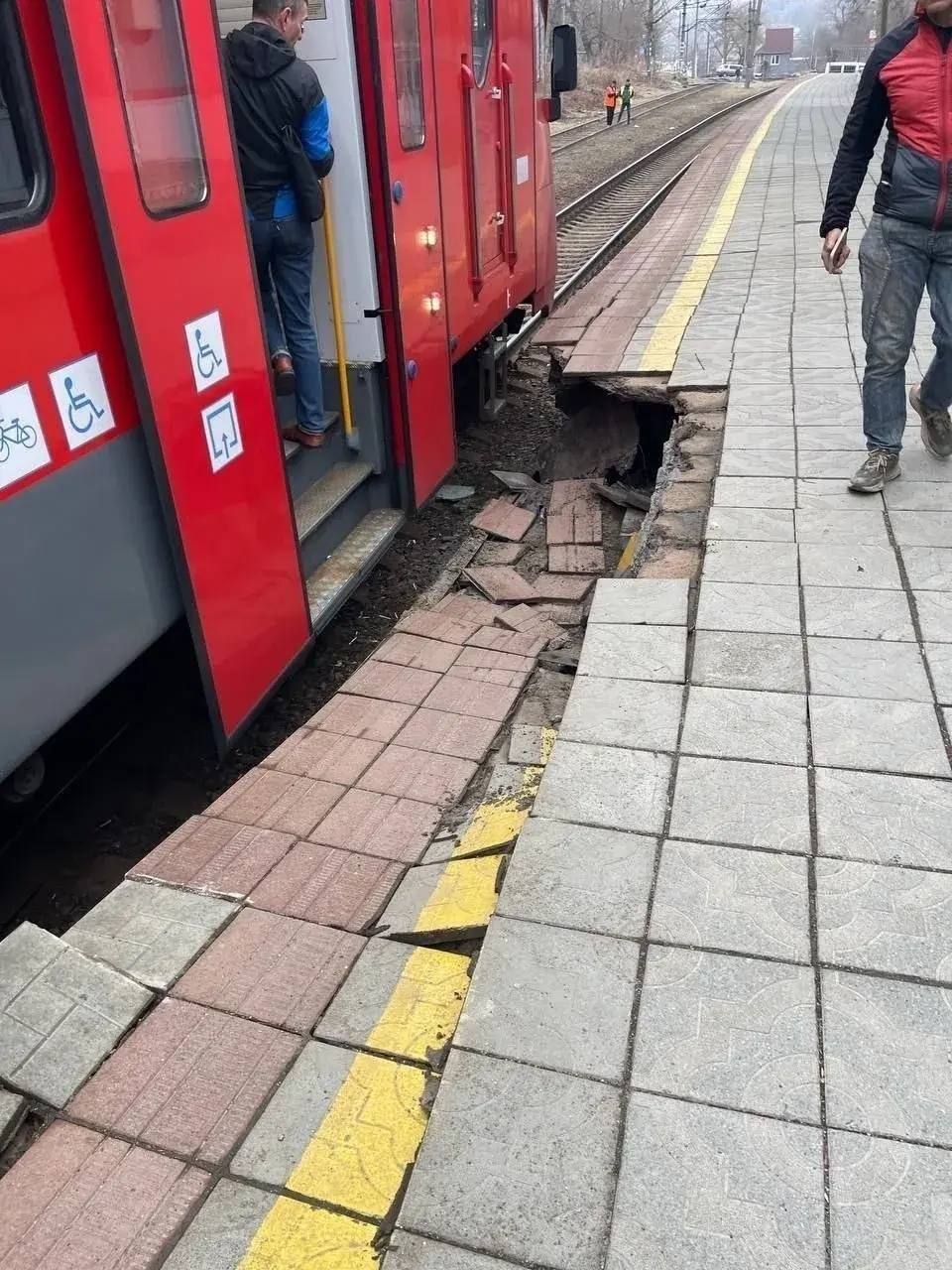 Инцидент произошел на станции Гайдамак в 8:24 утра. Сообщается, что около двадцати человек, в основном пожилого возраста, упали вместе с обломками перрона, который обрушился до уровня железнодорожных путей. Люди получили легкие ушибы, серьезных травм нет.